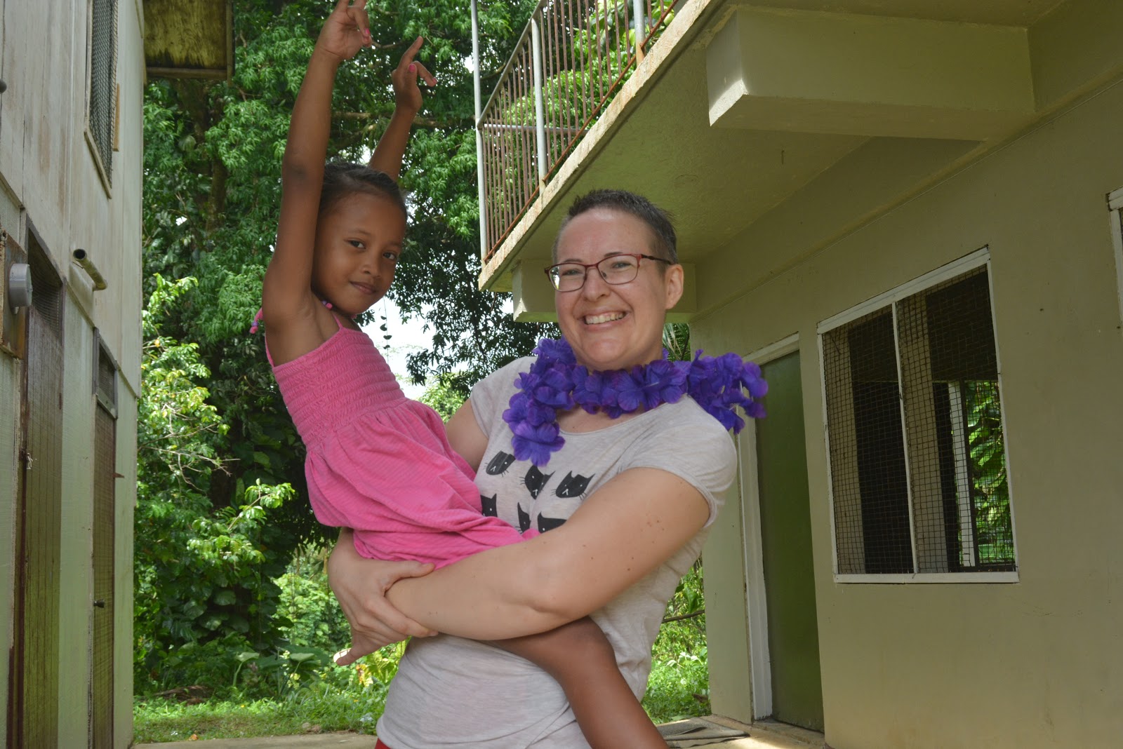 Eturivissä kotimatkalle lähtijät seppeloityinä, kuten maan tapoihin kuuluu. In the first row are those who were leaving. Local way to say goodbye is to give a lei. |